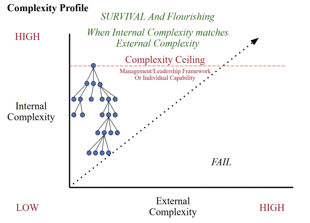This is an important concept in understanding the vulnerability of hierarchic centralized systems and even of distributed systems. In a centralized-hierarchic system – control comes from the top-center. This means that the capacity to generate response-able complexity to changing environments is limited by the ‘command-control-center’. Thus the capabilities of the command-control centralized hierarchy represents the ‘ceiling’ of it capacity to access it’s own complexity in order to generate responsive adaptation to its environment. The slide below is illustrative of the threshold of internal and external complexity for survival and flourishing