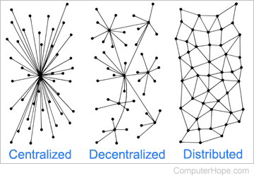 The third graph – called distributed, seems to be what is self-evidently truly decentralized – with no evident hub-center or spoke since all nodes connected to all neighbor nodes. Thus decentralized (literally no centers) and distributed seem to be the same thing.